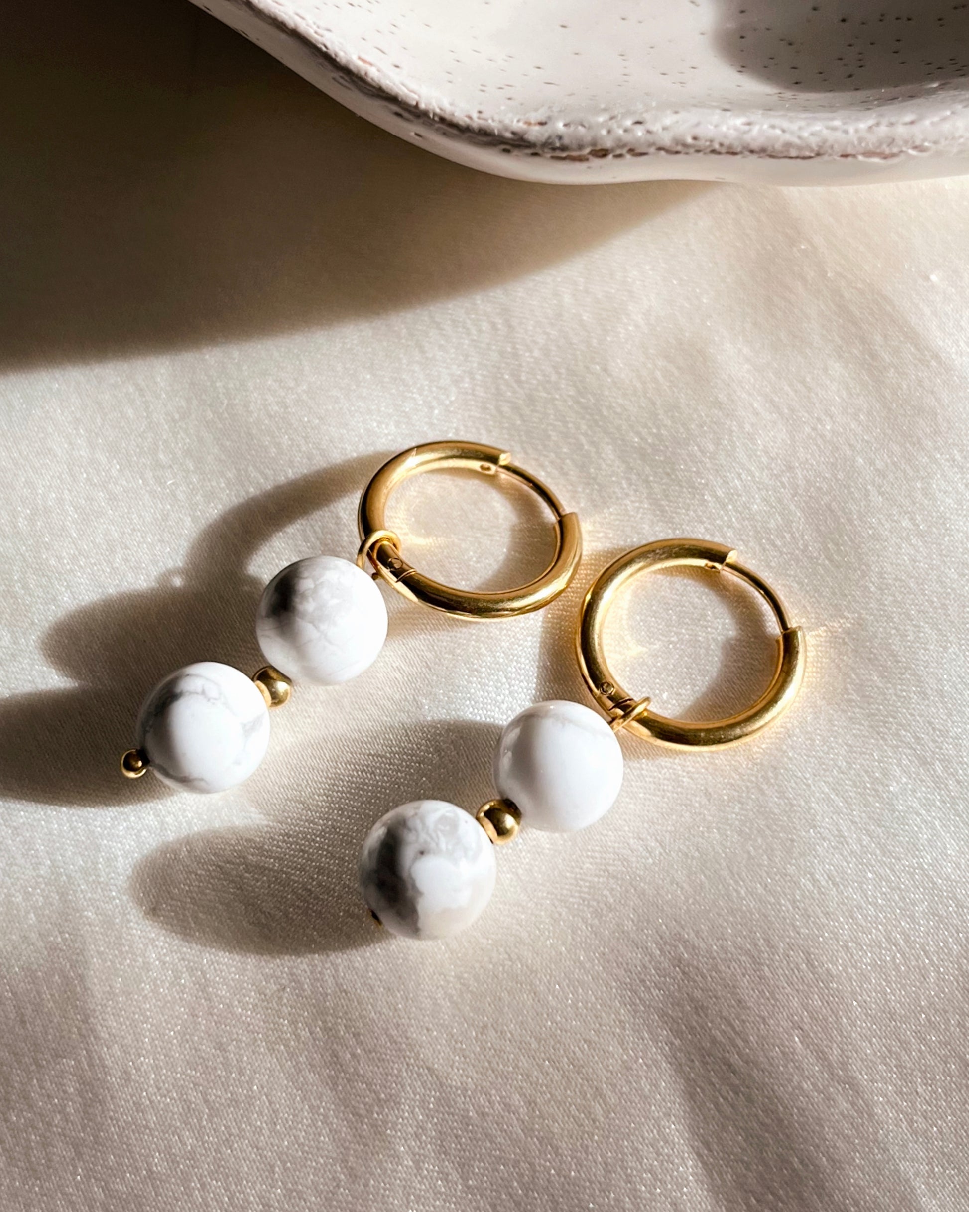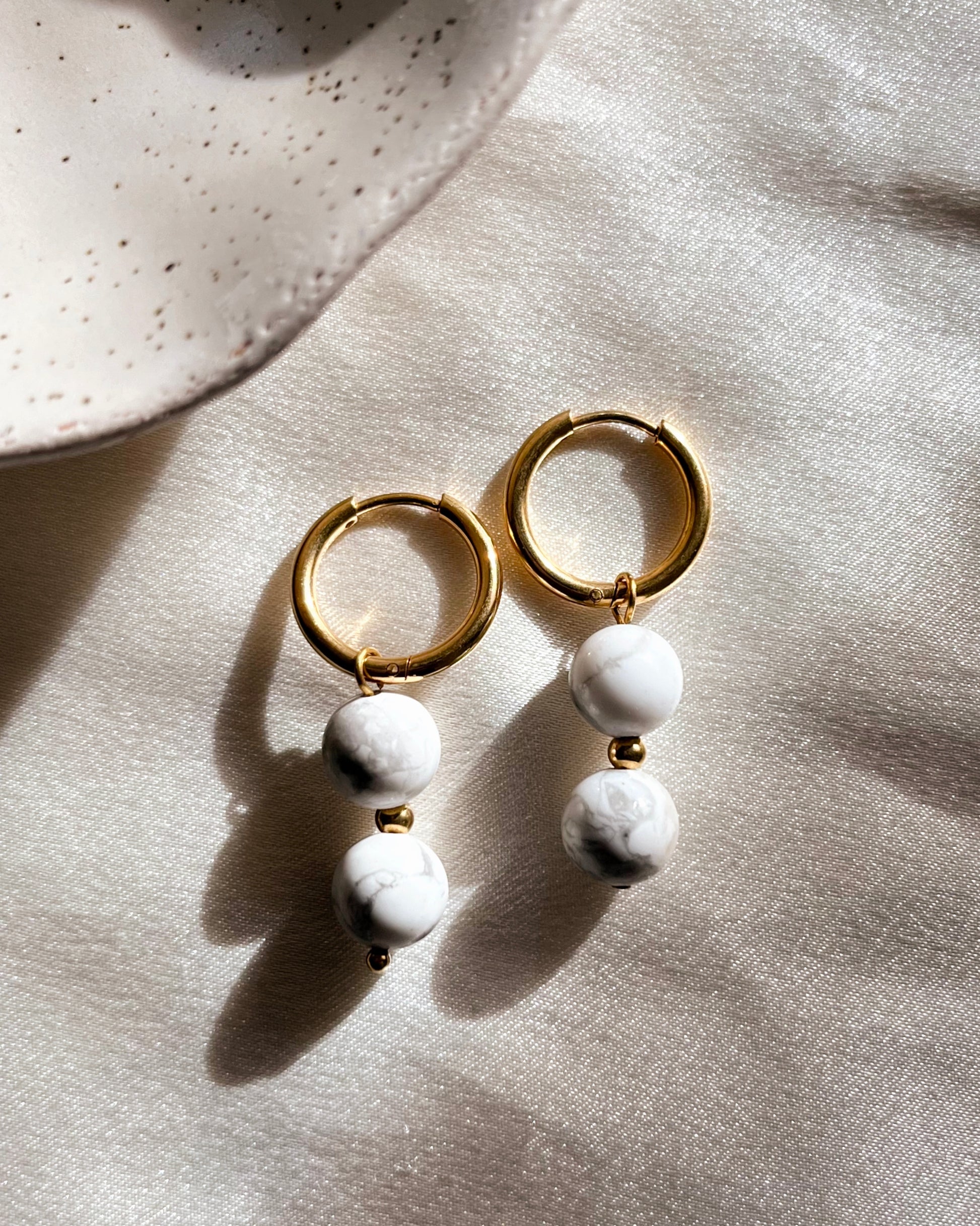 Les boucles “Capri” associent élégance et sérénité avec deux pierres naturelles d’Howlite Blanche, aux reflets marbrés.