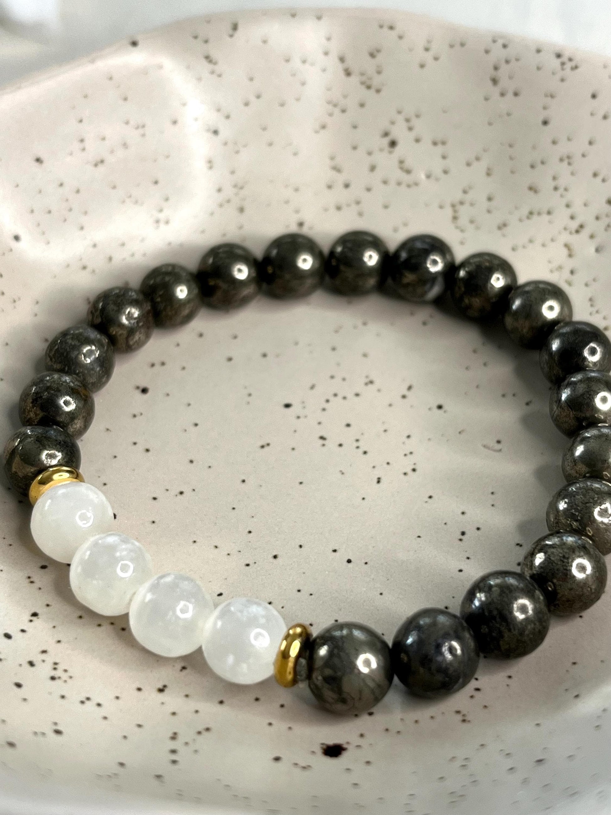 Élevez votre énergie avec ce bracelet alliant la puissance de la Pyrite et la douceur lumineuse de la Sélénite.