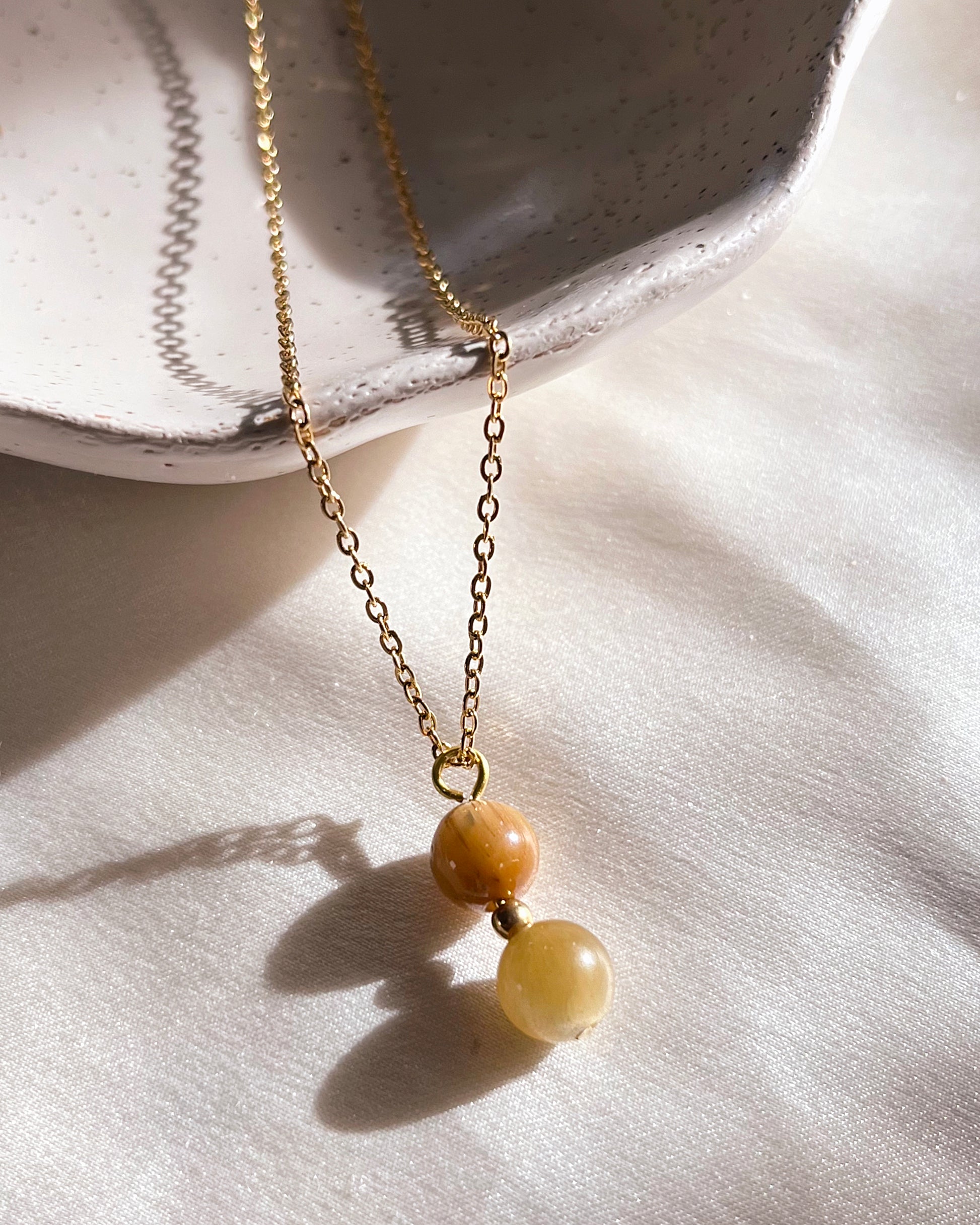 Sublimez votre énergie intérieure avec la parure solaire “Giorgia”, une alliance envoûtante de l’Œil de Tigre doré et de la Pierre de Lune.