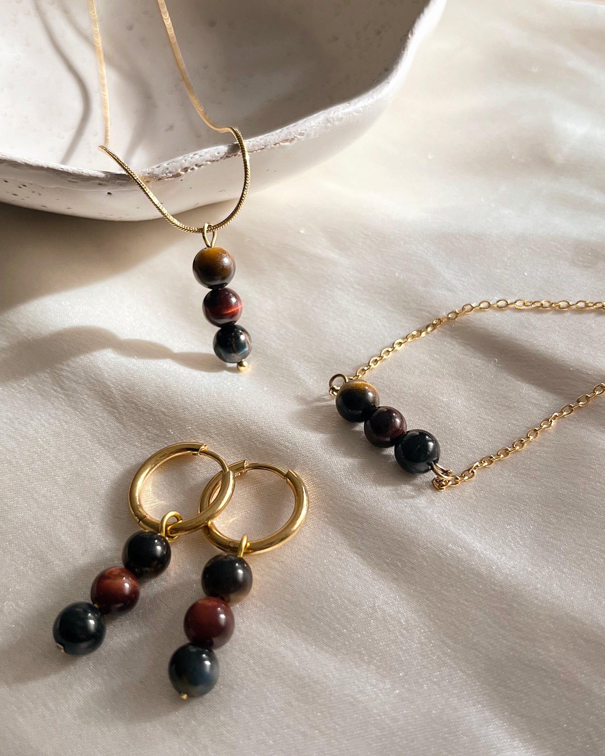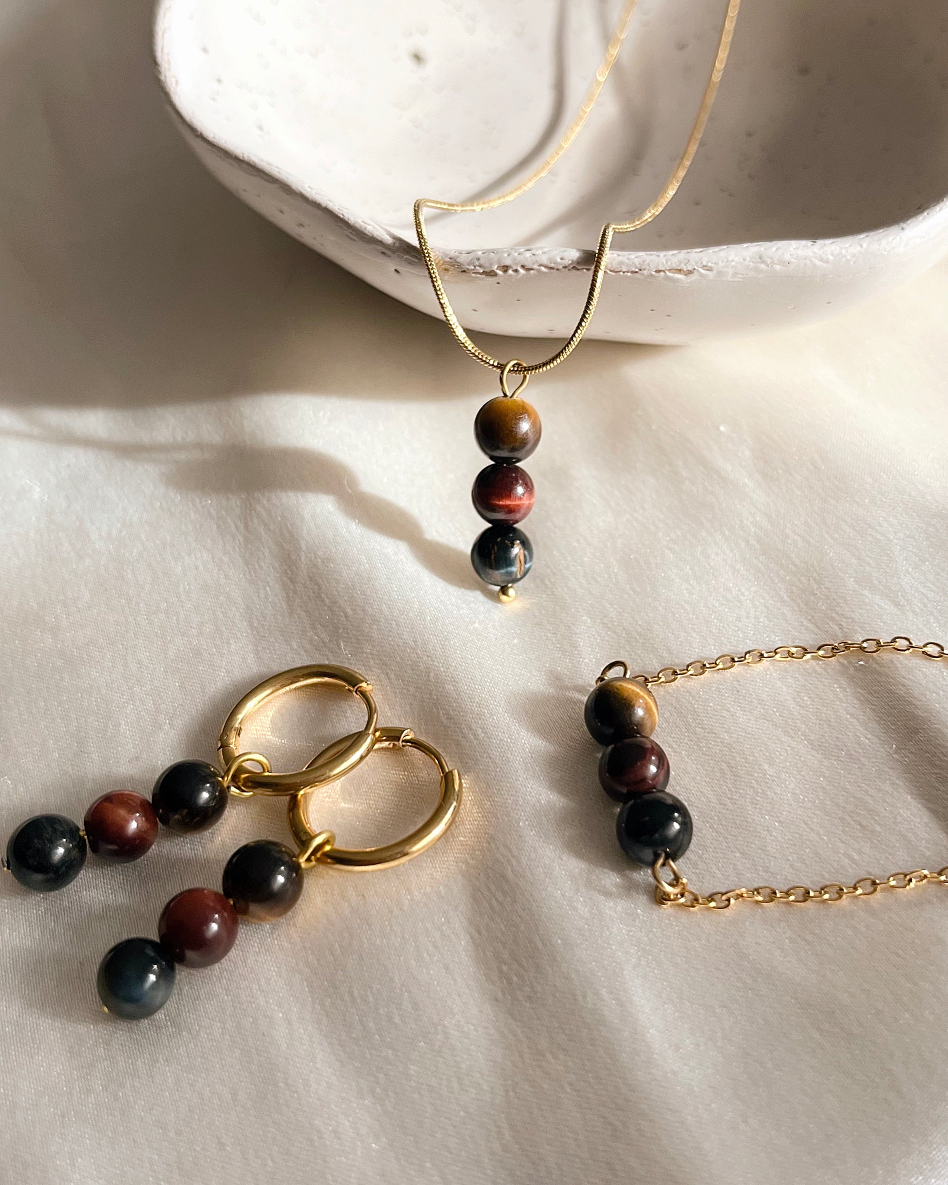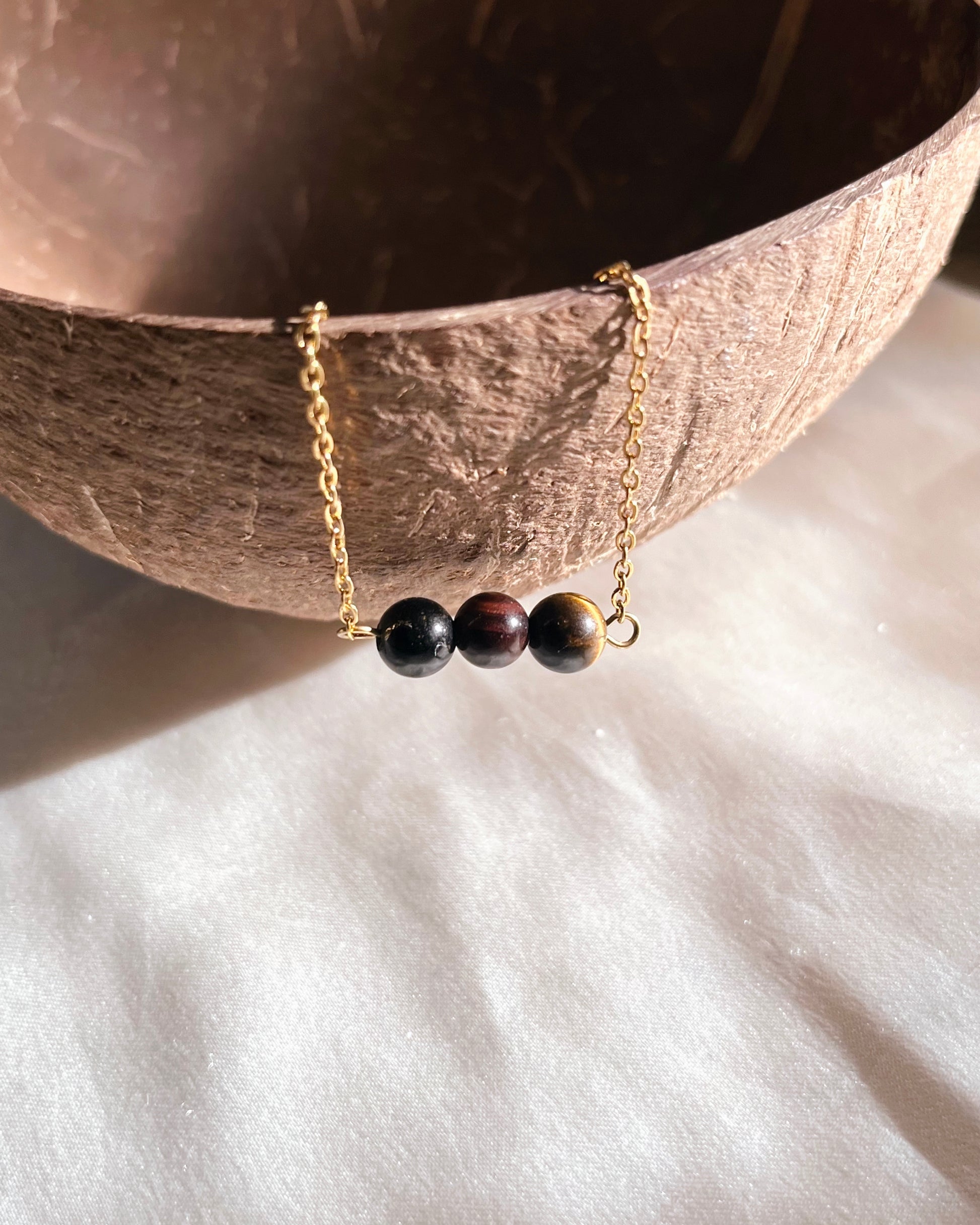 Conçue comme un bouclier énergétique raffiné, cette création unit trois pierres naturelles aux forces complémentaires pour révéler votre pouvoir intérieur avec élégance.